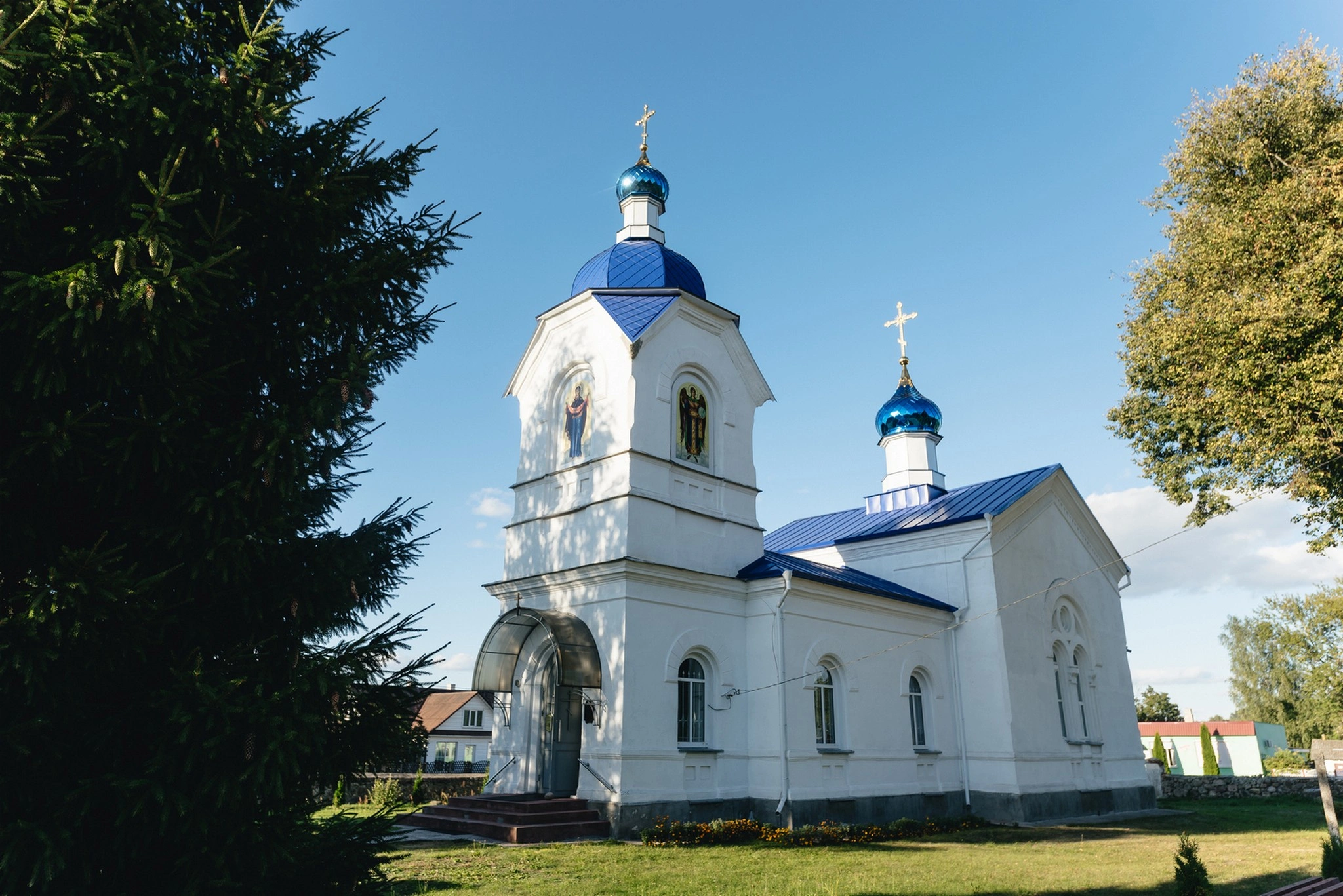 Храм был деревянный, с одним куполом и высокой колокольней. До середины ХІХ века Богослужения проводились по греко-католическому обряду. После восстания белорусской шляхты (1831-1833г.г.) все храмы перешли на православный обряд Богослужения. На территорию Слонимского уезда было прислано из Российских губерний ( преимущественно Тамбовской ) около 20 священников.В 1849 г.во Дворец присылают священника Константина Качановского. Он хлопочет об переустройстве храма, который к этому времени сильно обветшал. Отец Константин, обследовав состояние храма, стал хлопотать о строительстве нового. В начале 1960-х годов были выделены средства, а гродненским губернским архитектором Михайловским был создан проект.